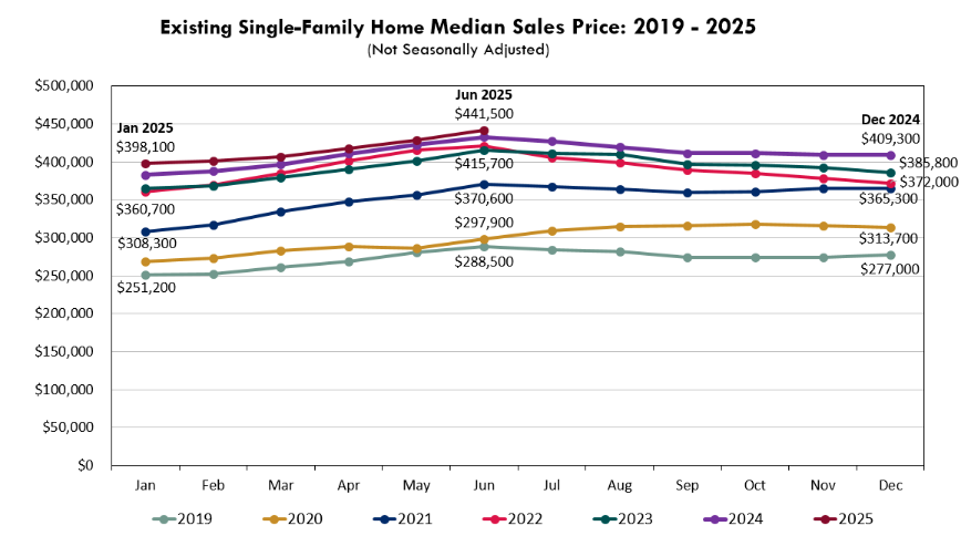 The number of existing single-family home sales in June 2025 came in at 3.57 million (seasonally adjusted annual rate), representing a slight year-over-year increase of 50,000 homes, or approximately 1.4%. What we are not seeing, though, is the sharp increase in home sales that typically happens during the spring and early summer months. In fact, June sales were actually slightly lower than in January, which is highly unusual.
