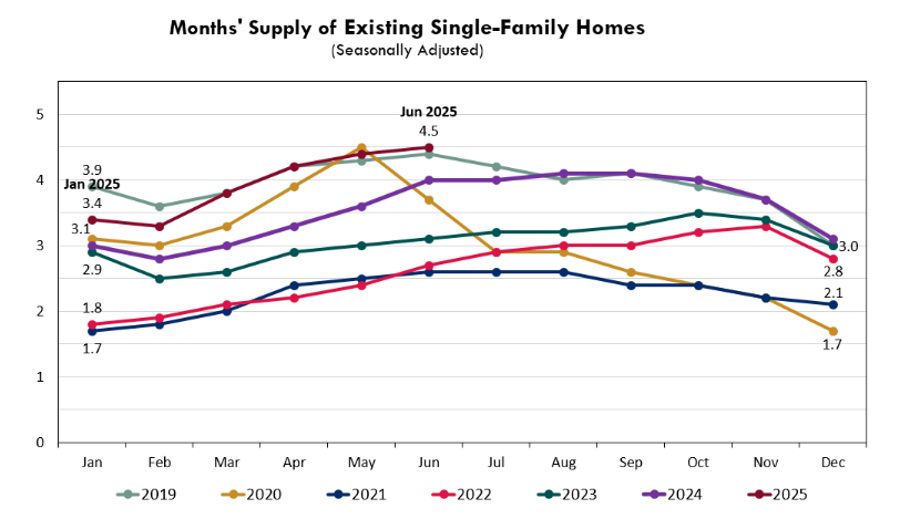 Another critical metric to watch is inventory. By the end of June 2025, months’ supply of existing single-family homes rose to 4.5 months—up from 4.0 months the year prior.