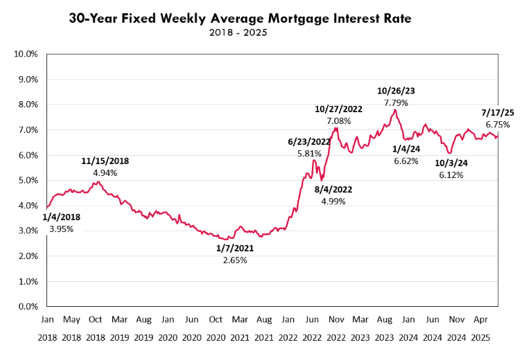 Freddie Mac reports that the average 30-year fixed mortgage rate held steady at 6.75% as of July 17. While this represents a nearly 1% decrease from its 2023 peak, rates remain stubbornly high by recent historical standards.